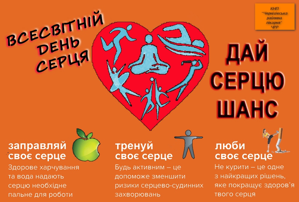 29 вересня за ініціативою Всесвітньої федерації серця та за підтримки Всесвітньої організації охорони здоров’я щорічно відзначається Всесвітній день серця, який у 2019 році проходитиме під гаслом «Моє серце, твоє серце».